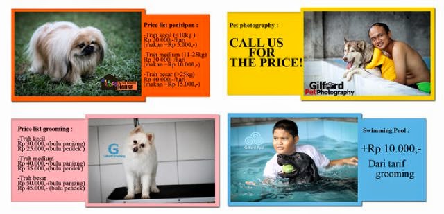 Setelah cari info kesana-sini, akhirnya ketemu deh pin BBnya si Gilford ini. Gilford ternyata bukan hanya menyediakan kolam renang untuk anjing, tapi juga ada boarding / penitipan dan juga grooming. Tapi sayangnya kolam renangnya gak buka setiap saat, hanya sebulan sekali. Jadi nanti sistemnya pihak Gilford share tuh di media sosial maupun status BBMnya kalo tanggal sekian kolam renangnya buka, nah nanti kita tinggal pesen aja mau dateng hari apa, jam berapa, dan berapa ekor anjing. Ohya, bukanya itu hanya weekend ya, Sabtu Minggu.