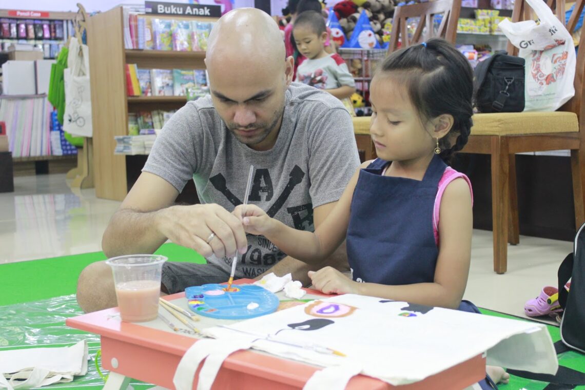 Saya selalu mudah jatuh hati dengan pemandangan seperti ini. Ya, ayah dan anak perempuannya. Citra ini saya dapat hari Minggu kemarin di sebuah workshop melukis di atas tote bag untuk anak – orang tua yang diadakan Digikidz. Sebenernya juga bukan cuma bapak ini yang nemenin anaknya, ada juga 2 bapak lain yang menemani anak laki-lakinya. Tapi memang saya selalu sentimentil melihat kedekatan seorang anak perempuan dengan papahnya. “Ah, paling karena papahnya ganteng aja sih…” Ahahaha.. iya ganteng sih, tapi saya lebih suka produk Indonesia gaess.. Truly, saya memang iri sama anak perempuan yang disayang dan deket sama papahnya, saya juga pengen. Bukan berarti saya sama sekali tidak pernah mendapatkan kasih…